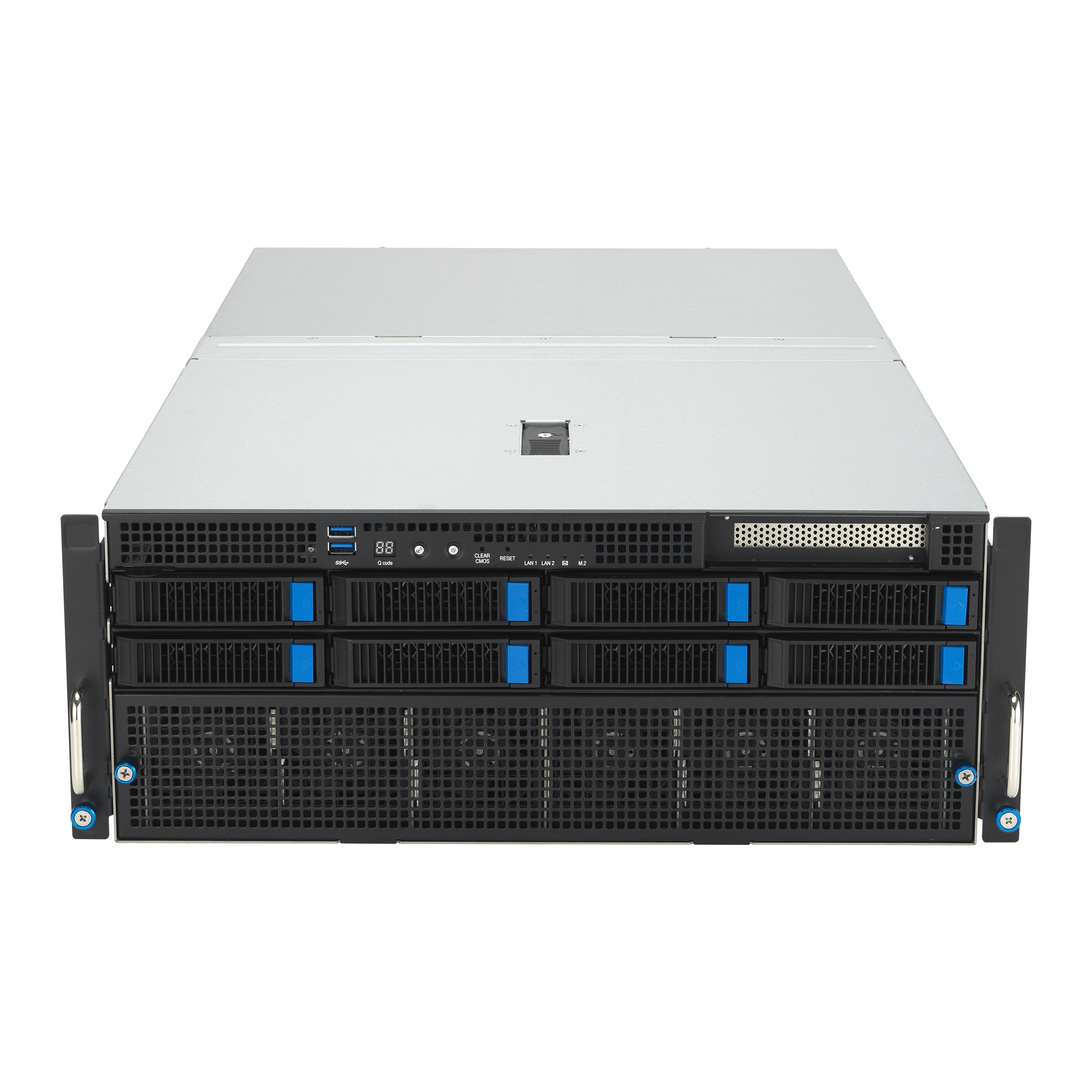 4U dual-socket GPU server powered by 5th Gen Intel Xeon Scalable processors that supports eight dual-slot GPUs, PCIe 5.0 Switch Solution, 32 DIMM, 13 PCIe 5.0, eight NVMe, four 3000W Titanium power supplies, OCP 3.0, and ASUS ASMB11-iKVM